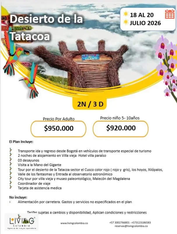 El Desierto de la Tatacoa es un destino imperdible para quienes buscan naturaleza sorprendente, cielos estrellados de otro mundo, patrimonio paleontológico y autenticidad cultural. Ofrece una mezcla rara de tranquilidad, visuales inolvidables y experiencias profundas, todo con un enfoque sostenible y comunitario. Ideal para escapadas de 2 a...